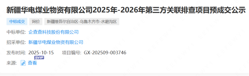 近日,企查查科技股份有限公司中标新疆华电煤业物资有限公司2025年-2026年第三方关联排查项目,招采单位为新疆华电煤业物资有限公司,采购方式为公开询比采购。据悉,新疆华电煤业物资有限公司为中国华电集团有限公司全资孙公司。